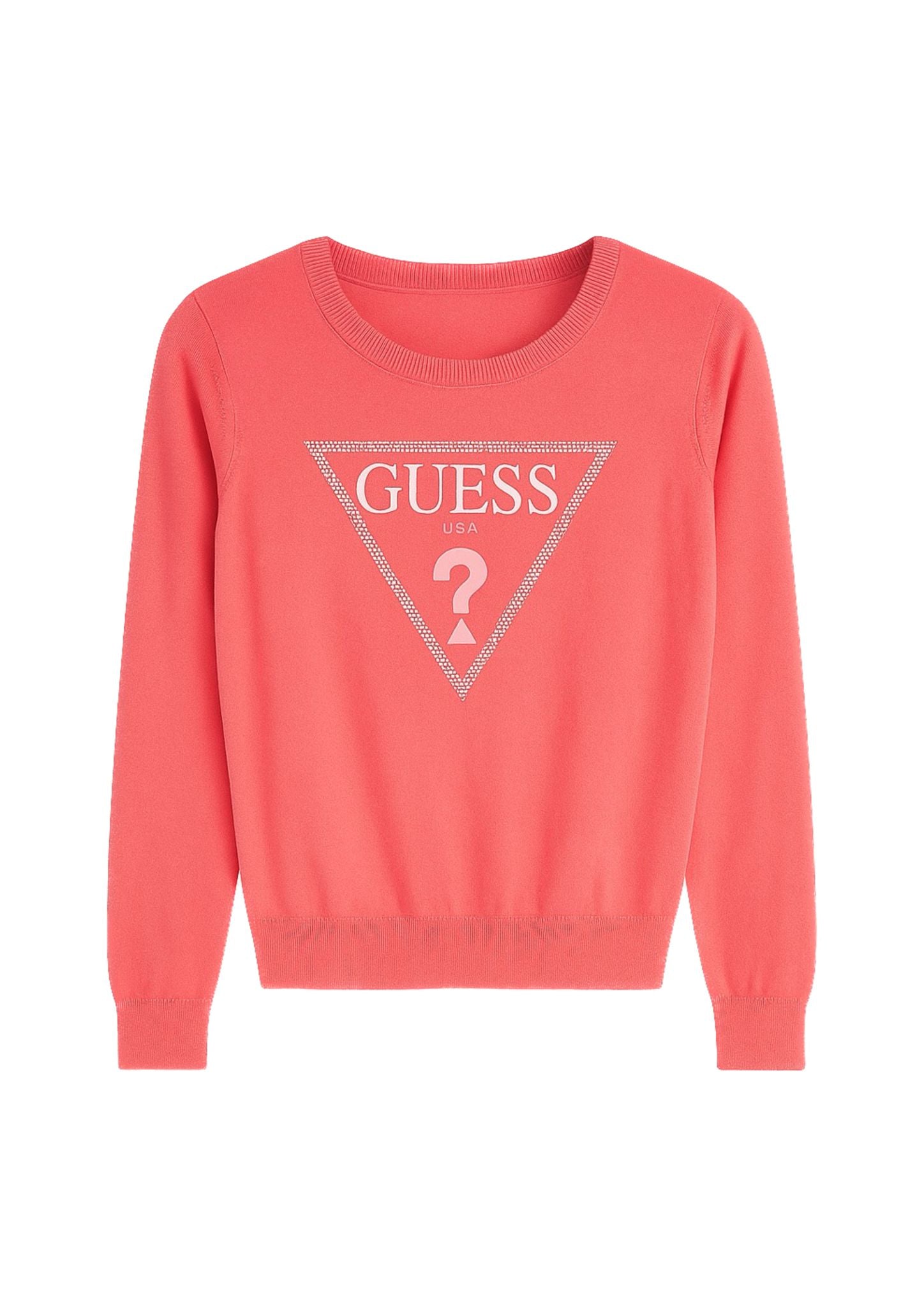 Il design classico con girocollo e maniche lunghe è arricchito dal maxi logo triangolare Guess sul davanti, impreziosito da dettagli luminosi che aggiungono un tocco femminile e glamour. L’orlo e i polsini a coste assicurano una vestibilità comoda e aderente.